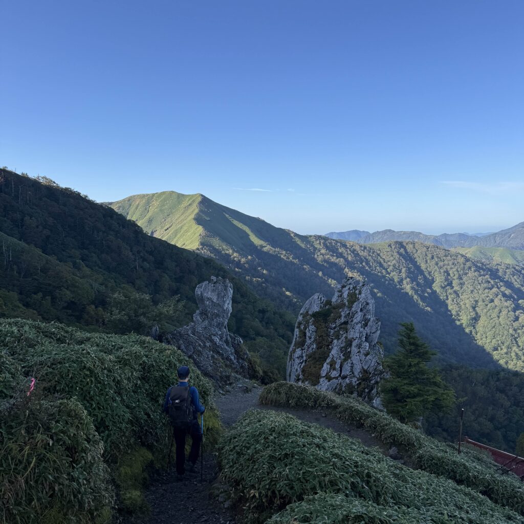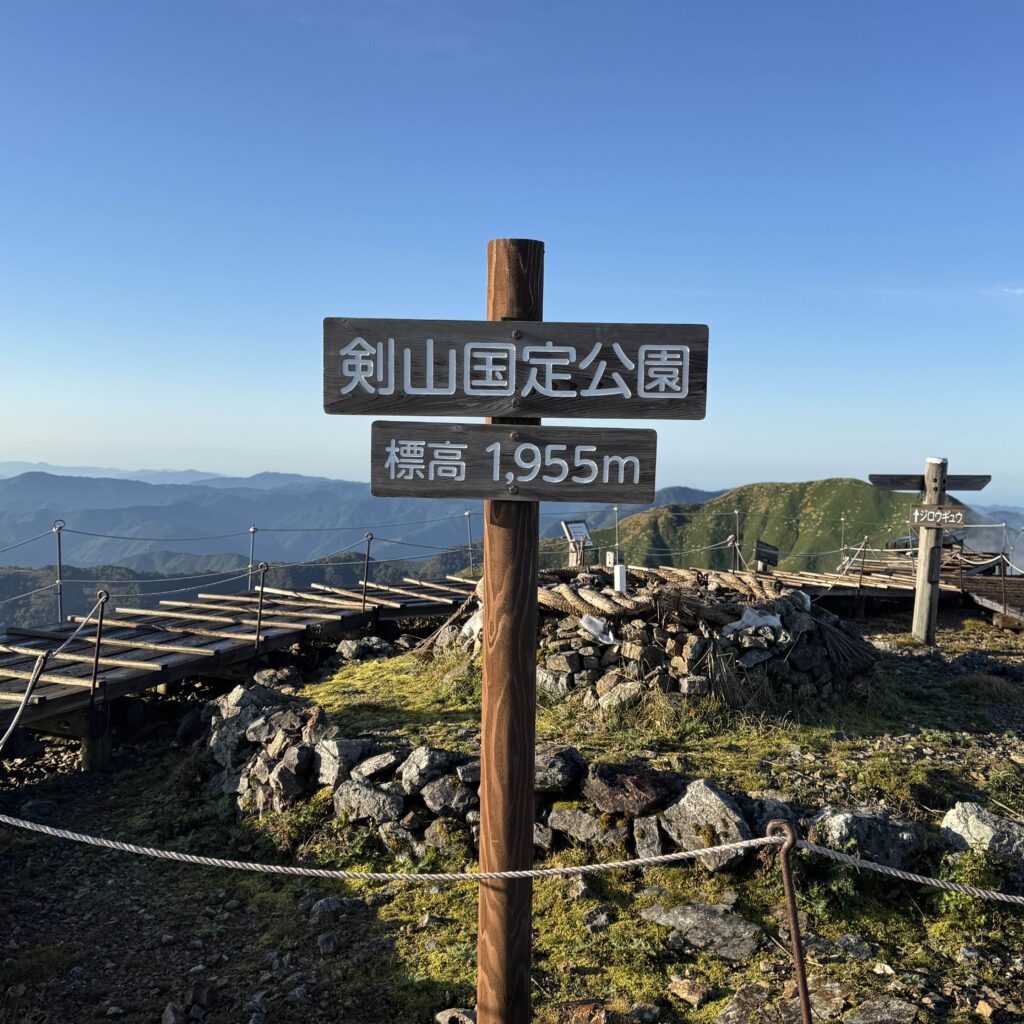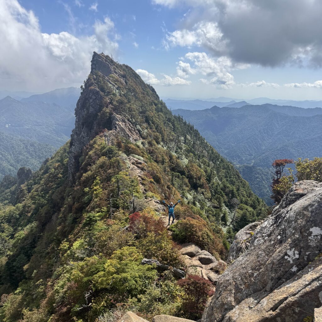 さらに山頂からの眺めが本当に素晴らしい。天狗岳が鋭く尖ったナイフのような姿でそびえていて、そのシルエットの美しさに見惚れてしまいました。四国まで足を運び、石鎚山に登れて本当に良かったと思える瞬間だった。