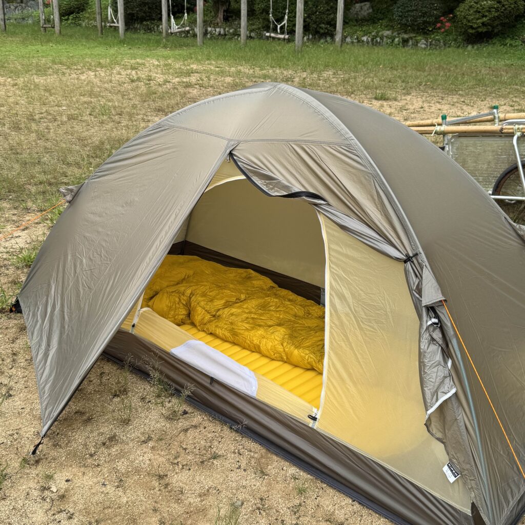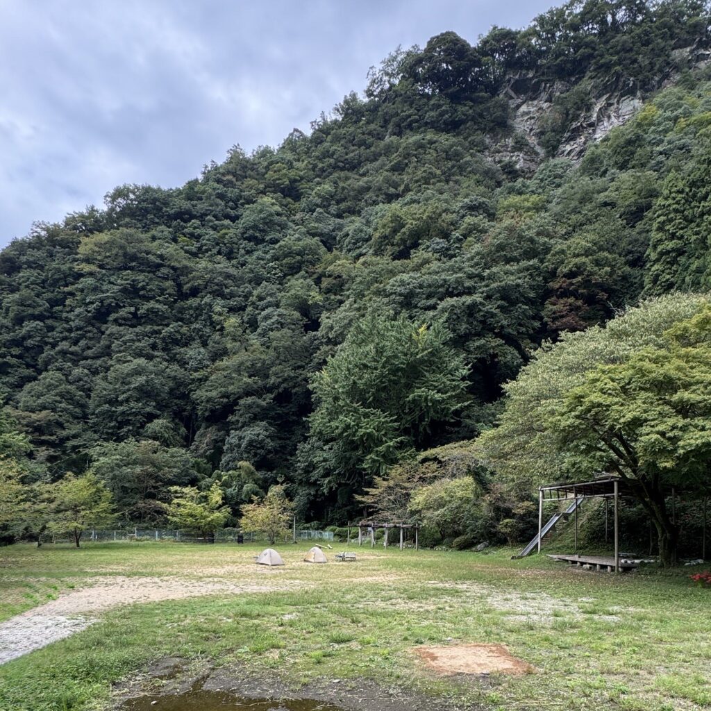 学校の跡地をキャンプ場に利用しているため、過去に校庭だった場所にテントを張った。地面が整っていてテントも張りやすかった。