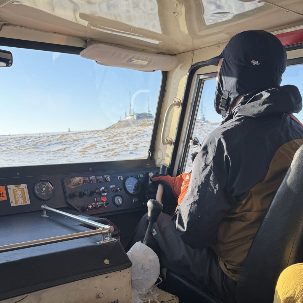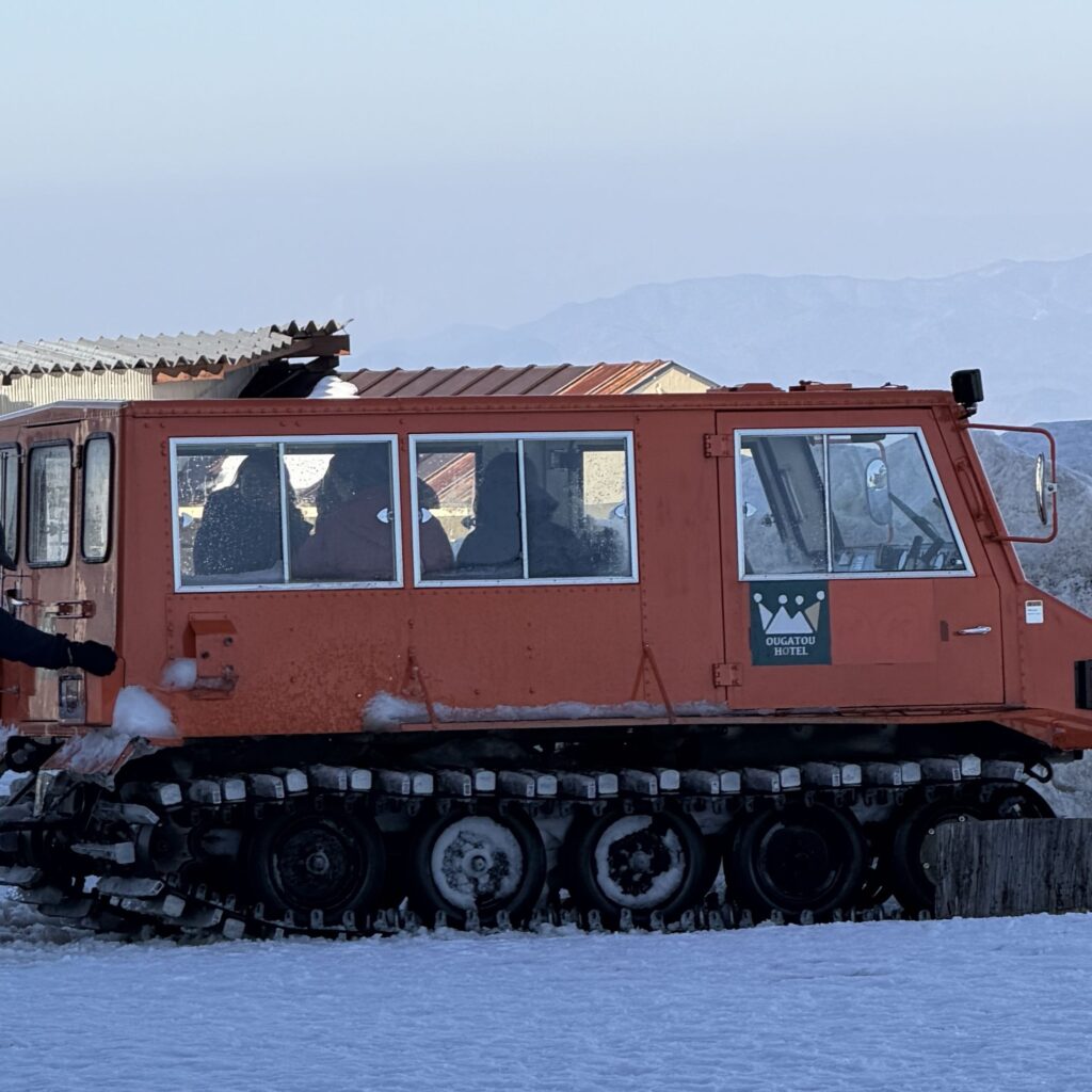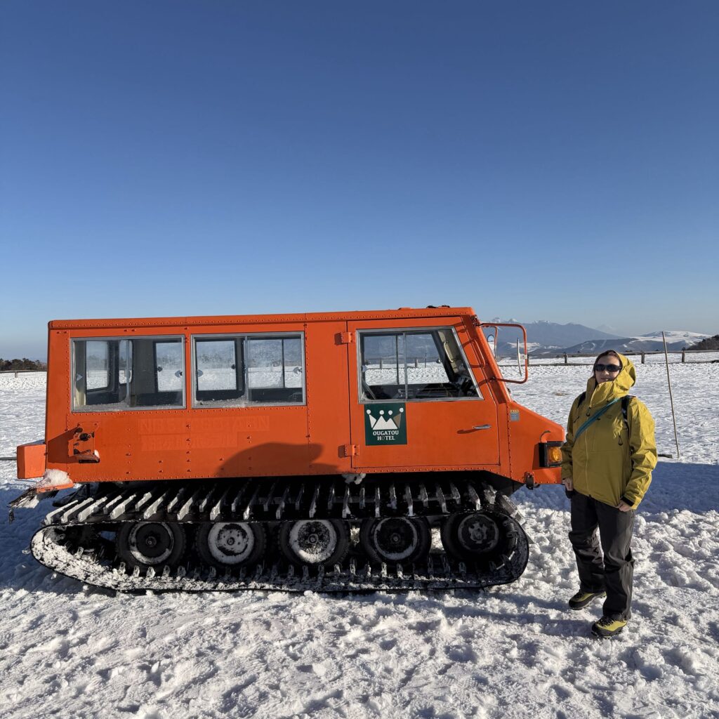 冬の美ヶ原高原。ホテルの玄関前に現れたのは、力強いキャタピラは非日常の極み!